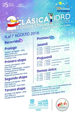 2da CLÁSICA IDRD ESTEBAN CHAVES BOGOTA MEJOR PARA TODOS 4 Agosto 2016 al 7 Agosto 2016 Documento Guia Técnica Documento Listado de Participantes Documento CLASIFICACION PROLOGO VELODROMO LUIS CARLOS GALAN Documento CLASIFICACION PRIMERA ETAPA EL TABLAZO Documento CLASIFICACION SEGUNDA ETAPA C.R.I PARQUE EL TUNAL Documento CLASIFICACION TERCERA ETAPA CIRCUITO PARQUE NACIONAL Carreras Recientes 13 Febrero 2026 I VALIDA COPA NACIONAL GW SHIMANO MTB 2026 5 Febrero 2026 CAMPEONATO NACIONAL DE RUTA SISTECREDITO 1 Febrero 2026 CAMPEONATO DEPARTAMENTAL DE RUTA -CUNDINAMARCA 2026 17 Enero 2026 TOUR EL SALVADOR 2026