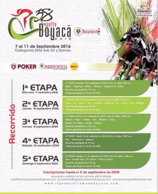 38 VUELTA A BOYACA 2016 7 Septiembre 2016 al 11 Septiembre 2016 Documento Guia Técnica Documento Listado de Participantes Documento CLASIFICACION PRIMERA ETAPA NOBSA-SOGAMOSO Documento CLASIFICACION SEGUNDA ETAPA PESCA-AQUITANIA Documento CLASIFICACION TERCERA ETAPA DUITAMA-SACHICA Documento CLASIFICACION CUARTA ETAPA C.R.I SUTAMARCHAN-SAMACA Documento CLASIFICACION QUINTA ETAPA SORA-CIRCUITO TUNJA Documento LISTADO DE INSCRITOS DAMAS Documento CLASIFICACION PRIMERA ETAPA DAMAS COMBITA-SACHICA Documento CLASIFICACION SEGUNA ETAPA DAMAS C.R.I SACHICA-SAMACA Documento CLASIFICACION TERCERA ETAPA DAMAS CIRCUITO TUNJA Carreras Recientes 13 Febrero 2026 I VALIDA COPA NACIONAL GW SHIMANO MTB 2026 5 Febrero 2026 CAMPEONATO NACIONAL DE RUTA SISTECREDITO 1 Febrero 2026 CAMPEONATO DEPARTAMENTAL DE RUTA -CUNDINAMARCA 2026 17 Enero 2026 TOUR EL SALVADOR 2026