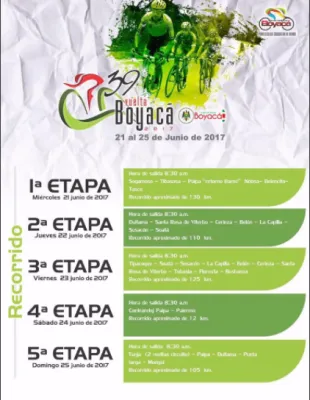 39 VUELTA A BOYACA 2017 21 Junio 2017 al 25 Junio 2017 Documento Listado de Participantes Documento LISTADO DE INSCRITOS DAMAS Documento CLASIFICACION PRIMERA ETAPA SOGAMOSO-TASCO Documento CLASIFICACION SEGUNDA ETAPA DUITAMA-SOATA Documento CLASIFICACION TERCERA ETAPA TIPACOQUE-BUSBANZA Documento CLASIFICACION CUARTA ETAPA CRI PAIPA-PALERMO Documento CLASIFICACION QUINTA ETAPA TUNJA-MONGUI Documento CLASIFICACION PRIMERA ETAPA DAMAS LA CAPILLA-BUSBANZA Documento CLASIFICACION SEGUNDA ETAPA DAMSA CRI PAIPA.PALERMO Documento CLASIFICACION TERCERA ETAPA DAMAS TUNJA-MONGUI Carreras Recientes 13 Febrero 2026 I VALIDA COPA NACIONAL GW SHIMANO MTB 2026 5 Febrero 2026 CAMPEONATO NACIONAL DE RUTA SISTECREDITO 1 Febrero 2026 CAMPEONATO DEPARTAMENTAL DE RUTA -CUNDINAMARCA 2026 17 Enero 2026 TOUR EL SALVADOR 2026