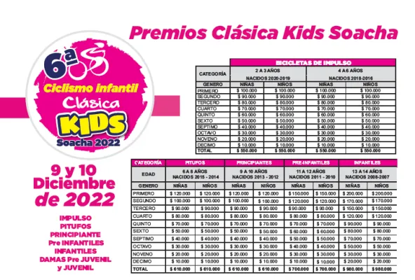 6 CLASICA DE SOACHA KIDS 9 Diciembre 2022 al 10 Diciembre 2022 Documento LISTADO DE INSCRITOS Documento RESULTADOS PRIMERA ETAPA SOACHA KIDS Documento CLASIFICACION SEGUNDA ETAPA SAOCHA KIDS Carreras Recientes 13 Febrero 2026 I VALIDA COPA NACIONAL GW SHIMANO MTB 2026 5 Febrero 2026 CAMPEONATO NACIONAL DE RUTA SISTECREDITO 1 Febrero 2026 CAMPEONATO DEPARTAMENTAL DE RUTA -CUNDINAMARCA 2026 17 Enero 2026 TOUR EL SALVADOR 2026