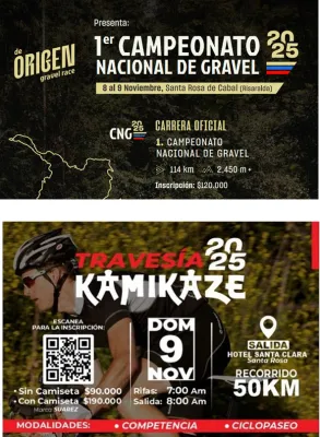 CAMPEONATO NACIONAL GRAVEL - TRAVESIA KAMIKAZE MTB 9 Noviembre 2025 Documento LISTADO DE INSCRITOS GRAVEL Documento LISTADO DE INSCRITOS TRAVESIA MTB Documento RESULTADOS NACIONAL GRAVEL - TRAVESIA KAMIKAZE Carreras Recientes 13 Febrero 2026 I VALIDA COPA NACIONAL GW SHIMANO MTB 2026 5 Febrero 2026 CAMPEONATO NACIONAL DE RUTA SISTECREDITO 1 Febrero 2026 CAMPEONATO DEPARTAMENTAL DE RUTA -CUNDINAMARCA 2026 17 Enero 2026 TOUR EL SALVADOR 2026