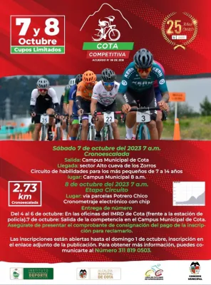 COTA COMPETITIVA 7 Octubre 2023 al 8 Octubre 2023 Documento CRI COTA 07 OCT 23 Documento CLASIFICACION CIRCUITO COTA Carreras Recientes 13 Febrero 2026 I VALIDA COPA NACIONAL GW SHIMANO MTB 2026 5 Febrero 2026 CAMPEONATO NACIONAL DE RUTA SISTECREDITO 1 Febrero 2026 CAMPEONATO DEPARTAMENTAL DE RUTA -CUNDINAMARCA 2026 17 Enero 2026 TOUR EL SALVADOR 2026