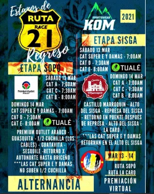 RUTA 21RACE - EJECICLISMO 13 Marzo 2021 al 14 Marzo 2021 Documento RESULTADOS PRIMERA ETAPA Documento RESULTADOS SEGUNDA ETAPA Carreras Recientes 28 Marzo 2026 VI CLASICA NAL CLUB DEPORTIVO PROVIMAR - TECNISEG 24 Marzo 2026 VUELTA AL VALLE DEL CAUCA 2026 20 Marzo 2026 II VALIDA COPA NACIONAL COPA NACIONAL GW SHIMANO MTB 16 Marzo 2026 CAMPEONATO PANAMERICANO DE RUTA MONTERIA 2026